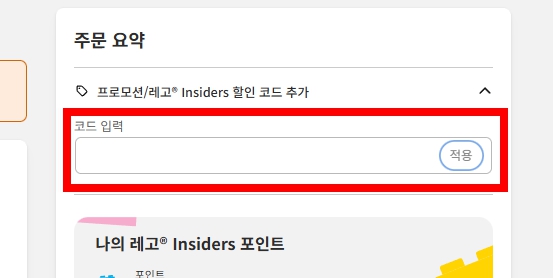 “프로모션/레고 Insiders 할인 코드 추가” 영역에서 입력하게 됩니다.